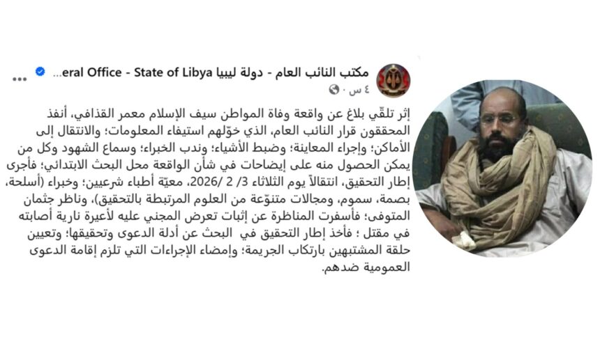 وقال مكتب النائب العام في بيان على صفحته الرسمية بموقع فيسبوك: “تلقّت الجهات المختصة بلاغاً بوفاة المواطن سيف الإسلام معمر القذافي، فباشرت النيابة العامة التحقيقات وفق الإجراءات القانونية المعمول بها، وقد منح النائب العام المحققين صلاحيات استيفاء المعلومات، والتنقل إلى الأماكن، وإجراء المعاينة، وضبط الأشياء، وندب الخبراء، وسماع الشهود وكل من يمكن الحصول منه على إيضاحات بشأن الواقعة”.