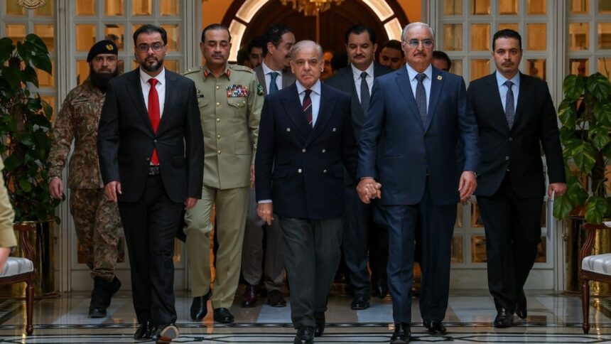 عقد القائد العام للقوات المسلحة العربية الليبية المشير خليفة حفتر، مباحثات رفيعة المستوى مع رئيس الوزراء الباكستاني محمد شهباز شريف، في العاصمة الباكستانية إسلام آباد، وذلك في إطار زيارة رسمية تهدف إلى تعزيز العلاقات الثنائية وتوسيع مجالات التعاون بين البلدين.