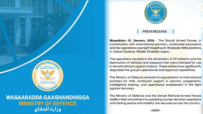 وذكر بيان للقوات المسلحة الصومالية، أنه “بالتنسيق مع الشركاء الدوليين، نفذت غارات جوية دقيقة متتالية في جاباد غودان، وسط شبيلي، مما أسفر عن القضاء على 29 مسلحاً من حركة الشباب وتدمير المركبات والأسلحة، التي كانت مخصصة للاستخدام في هجمات إرهابية ضد المدنيين”.