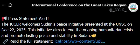 رحبت أمانة المؤتمر الدولي، لمنطقة البحيرات العظمى (ICGLR)، بمبادرة السلام التي قدمتها الحكومة الانتقالية السودانية إلى مجلس الأمن الدولي في سبتمبر الماضي.