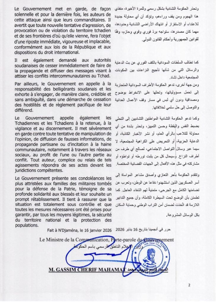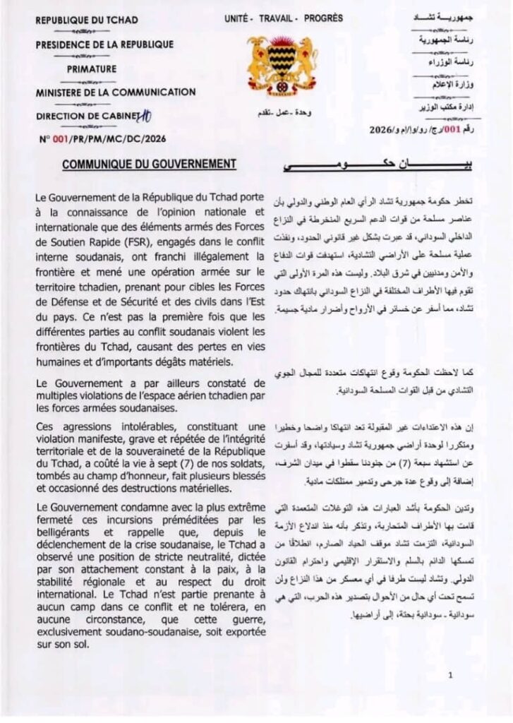وأكدت تشاد في بيان باللغتين العربية والفرنسية، نشرته صحيفة انجمينا الجديدة، أن الهجوم أسفر عن مقتل سبعة جنود تشاديين، وإصابة آخرين، واصفة هذا التصرف بأنه انتهاك صارخ لسيادة الدولة ووحدة أراضيها.
