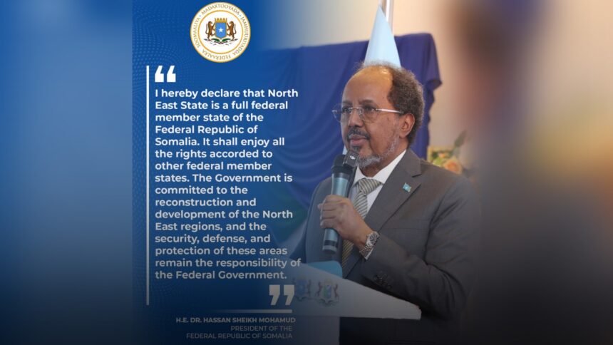 أعلن الرئيس الصومالي، حسن شيخ محمود، منح ولاية الشمال الشرقي العضوية الكاملة النظام الاتحادي لجمهورية الصومال الفيدرالية، وتمتعها بكامل الحقوق المقررة لبقية الولايات الأعضاء.