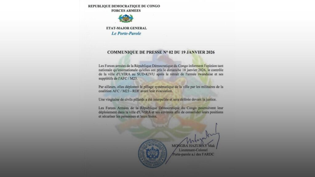 أعلنت القوات المسلحة لجمهورية الكونغو الديمقراطية أنها بسطت سيطرتها الكاملة على مدينة أوفيرا في إقليم جنوب كيفو، يوم الأحد 18 يناير 2026، عقب انسحاب الجيش الرواندي والعناصر المساندة له التابعة لتحالف AFC / M23.