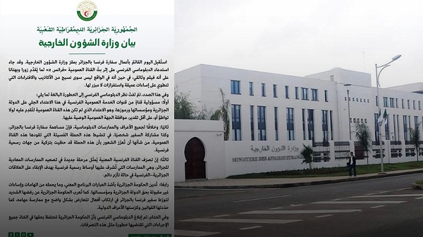 واختتم البيان بالتأكيد على أن الحكومة الجزائرية أبلغت الدبلوماسي الفرنسي باحتفاظها بحقها الكامل في اتخاذ جميع الإجراءات التي تقتضيها خطورة مثل هذه التصرفات.